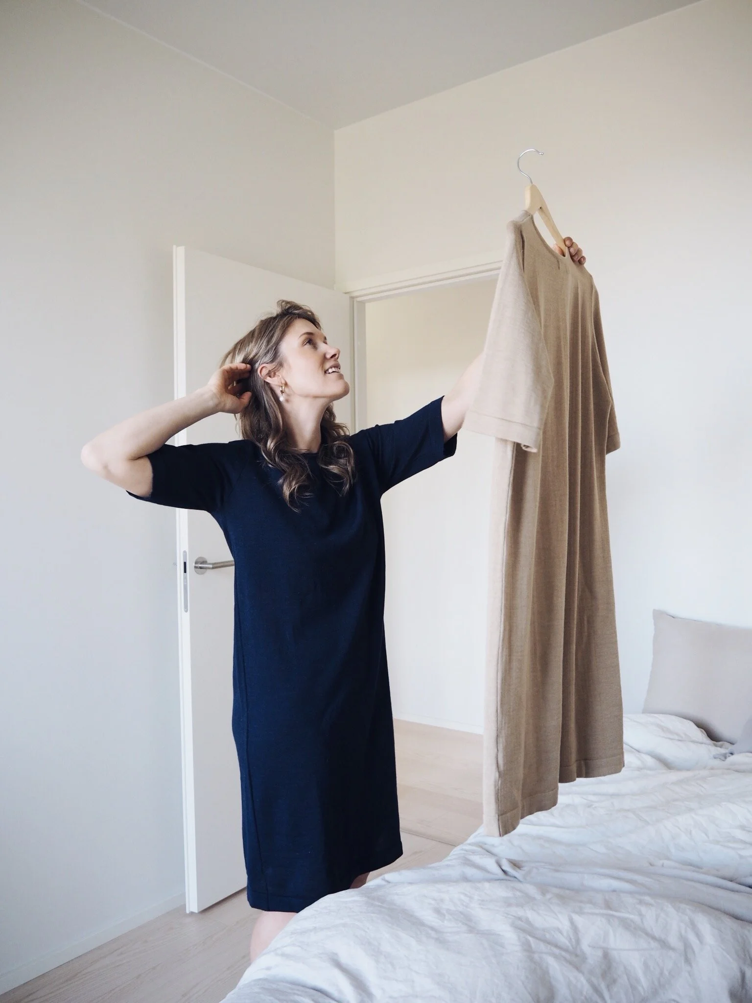minimalismin ylistäjänä ihastuin Alpan uuteen mallistoon, jonka yksinkertaisen kauniissa vaatteissa on yhdistetty alpakan villaa ja mulperisilkkiä. mallisto pitää sisällään neuletakkeja, täydellisiä lyhythihaisia neulepaitoja sekä tämän upean yksinkertaisen ja henkäyksen kepeän Poem-neulemekon. A-linjainen mekko on ainut mekkomalli, missä viihdyn ja tunnen oloni kotoisaksi. vastaavan mallista mekkoa löytyy kaapistani kaksi kappaletta jo entuudestaan, mutta tämä villasilkkinen versio on aivan omaa luokkaansa.
